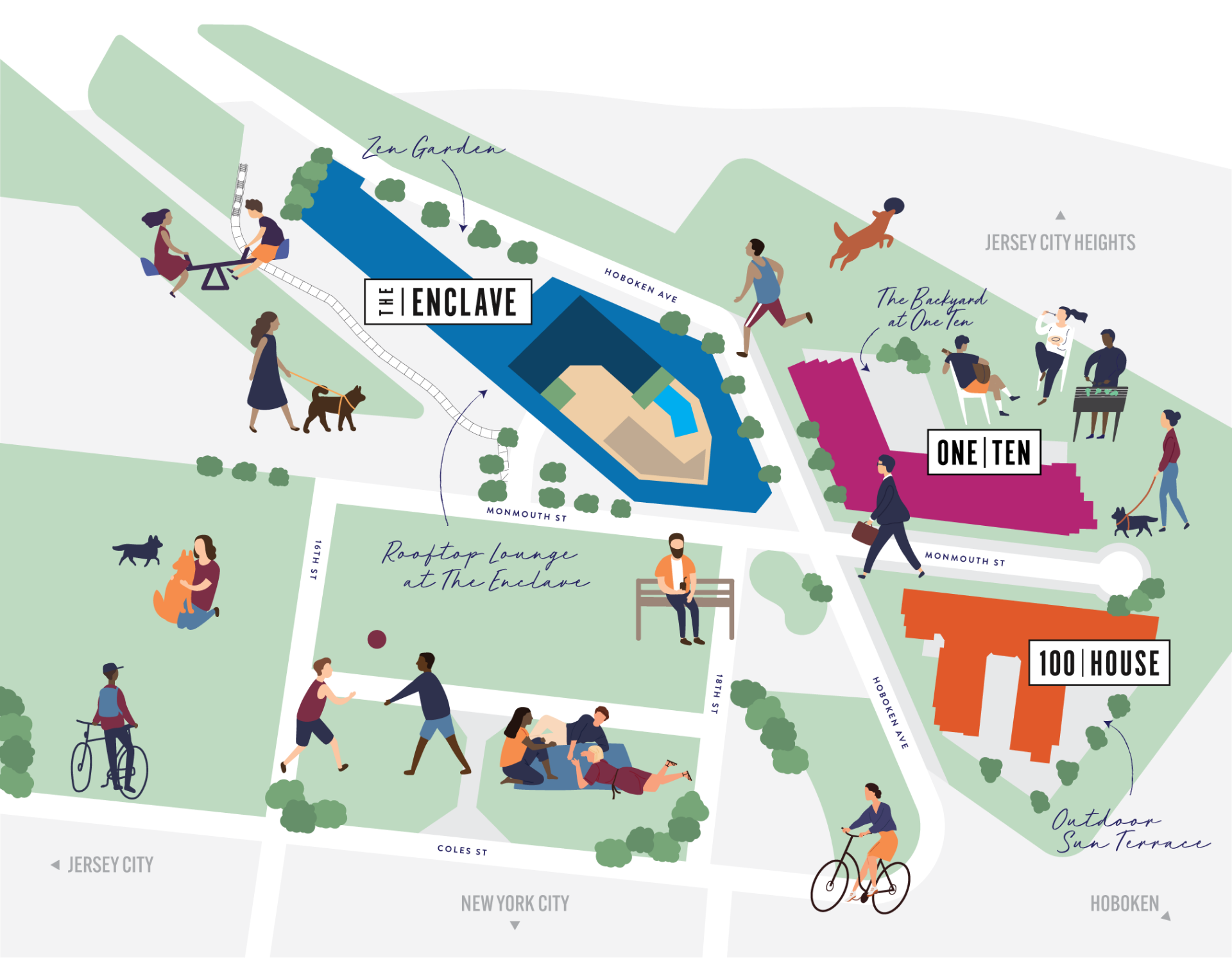 Discover a sanctuary surrounded by walking paths and green spaces at the intersection of Hoboken and Jersey City. Conveniently located at the crossroads of two cities that offer the best in culture, parks, dining, and recreation, with quick access to the PATH, ferry, and the NJ Turnpike, and with Citi Bikes and complimentary shuttle service right outside your doorstep.
